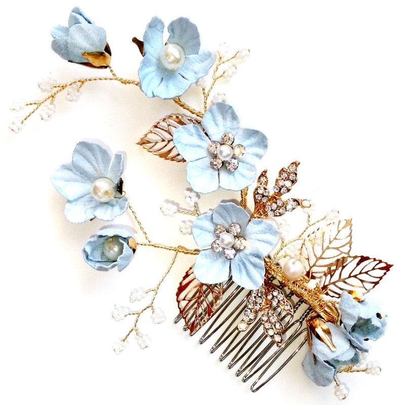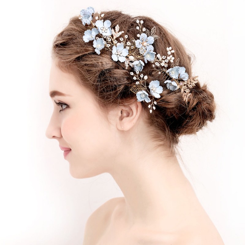 Romantická kvetinová ozdoba do vlasov môže krásne skrášľovať svadobný účes nevesty alebo svadobného doprovodu. Hrebene sú vyrobené z kovovej zliatiny, na ktorej sú prilepené vetvičky s modrými kvetmi a zlatými lístkami. Môžete ich tvarovať v účesu podľa potreby. Veľmi jemný a inšpirujúci doplnok pre slávnostné príležitosti.