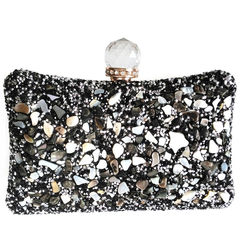 Zaujímavá luxusná malá čierna spoločenská kabelka mnohých zaujme už na prvý pohľad. Jej nezvyklé čierno-strieborné trblietavé kamienkové prevedenie nie je bežný štýl. Tento model je určený pre dievča alebo ženu, ktorá sa nebojí nevšedných doplnkov. Možno ju použiť ako netradičnú kabelku na spoločenskú príležitosť, na ples, večeru alebo inú slávnostnú príležitosť a tiež všade tam, kde potrebujete mať po ruke všetky svoje nevyhnutnosti. Odnímateľná zlatá retiazka umožňuje nosenie tejto krásnej kabelky aj cez rameno.