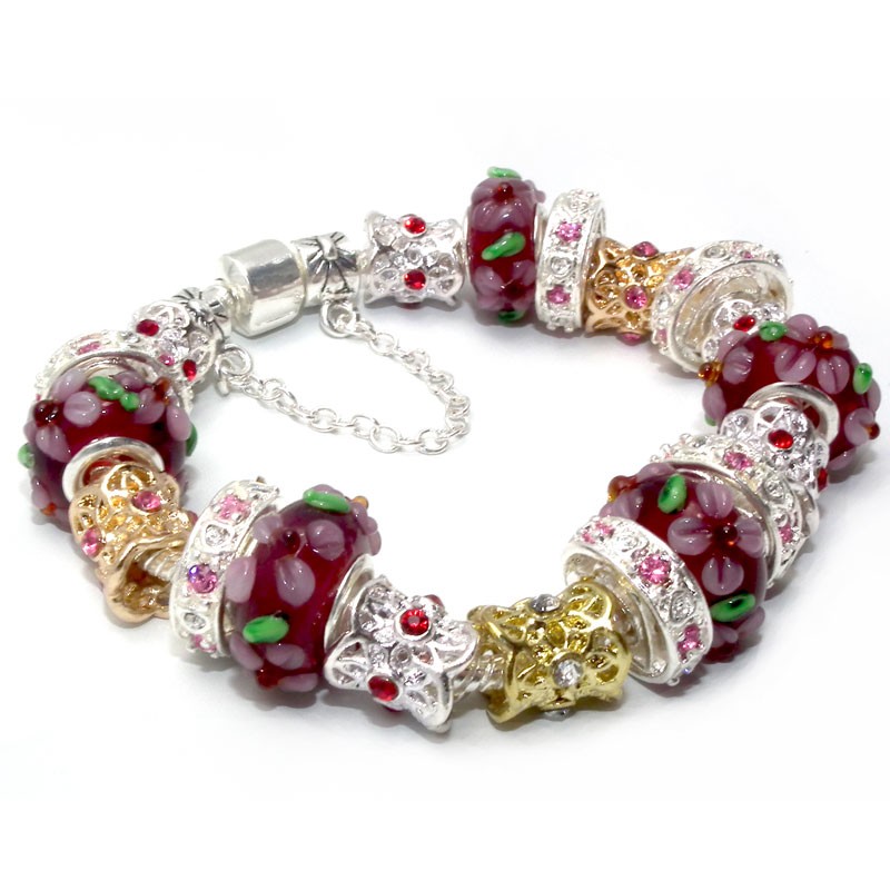 Veľmi zaujímavý náramok z novej kolekcie náramkov "design by SIRAPI. Strieborný náramok v modernom pando štýle je doplnený príveskami, ktoré sú pozlátené alebo postriebrené a osadené kryštálmi. Náramok "Crystal flower" má tiež krásne ručne zdobené 3D prívesky v tvare kvietkov, vyrobené z muránskeho skla.