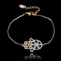 Jemný retiazkový náramok s karabínkou, ktorý zaujme ozdobou v tvare ruky. Tá je bohato zdobená bielymi a modrými zirkony.Tento blištivý šperk je ideálny do divadla, spoločnosti, na koncert aj iné slávnostnejšie príležitosti. Je to vhodný a milý darček od partnera, priateľa, kamarátky ako potvrdenie skvelého vzťahu, priateľstvo, kamarátstvo