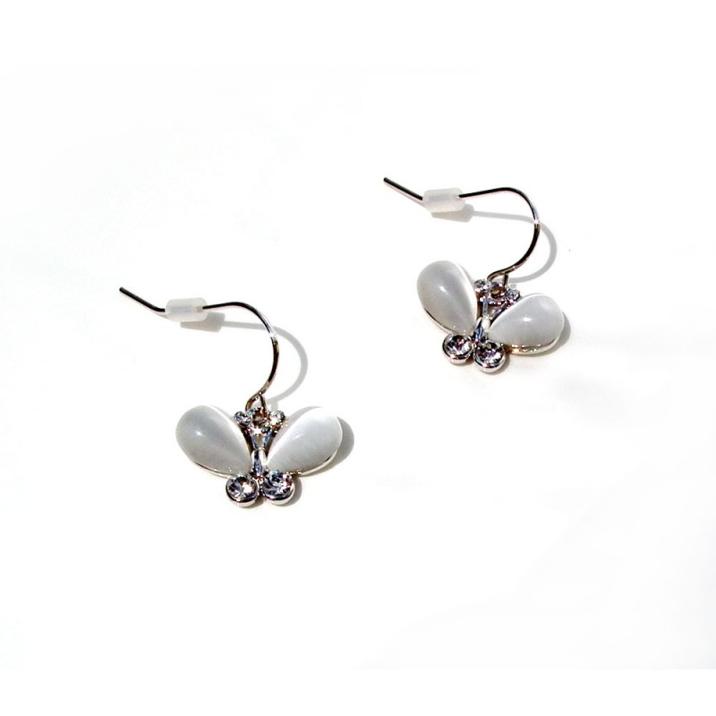 Náušnice s opálom, rhodiované, osadené kryštálom. Majú tvar motýľov, veľmi pekné a jemné prevedenie. K náušniciam máme tiež prívesok s retiazkou na krk alebo náramok. Oboje v rovnakom dizajne.