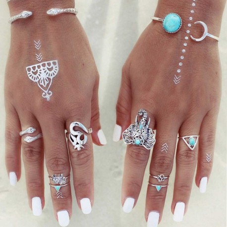 Krásna sada prstienkov "iNDIC Rahu" rozžiari vaše ruky. Letný nádych a veľkú pozornosť obdivovateľov, to prinesú prstienky v striebornej farbe vaším rukám. Krásne sa vynímajú na opálenej pokožke a môžete ich doplniť aj rôznymi tetovačkami z našej ponuky.